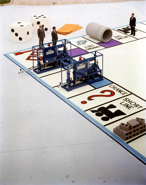 Game Board We painted a Monopoly board on a parking lot for Vapor Energy, a company that makes the machines that steam mould concrete. They placed the machines on the board for a print advertisement. The chance cards are 4 x 8 sheets of masonite painted orange. |