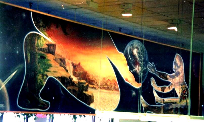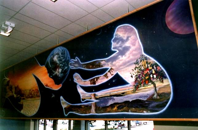 Whole Foods Coit Road, Dallas, Texas This cosmic mural features an adult handing over the world to a child. The landscape within the people changes from barren and dry to lush and beautiful. |