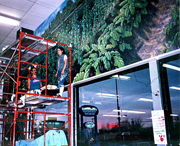 First contact us by email or phone and we will find out a few basics like where, what and when. If you are long distance, email us a photo of your environment and some information about the space where you would like the mural. We can then evaluate how best to proceed with a design. If you need help with a design or ideas for your mural, we are happy to offer many possibilities. Our design phase is included in the price of the mural. For a basic design that we do not paint we charge $150. With a design agreed upon, we will estimate what is required to access the place where the mural will go and how long it will take to complete. Frequently with cloud paintings on a ceiling, we can show you a photo from our large collection of samples and we are ready to paint!