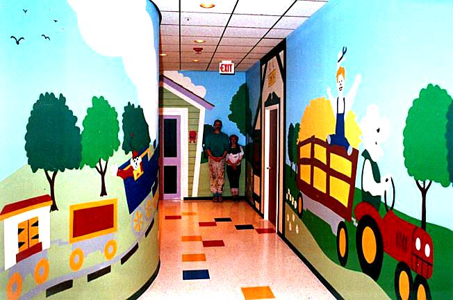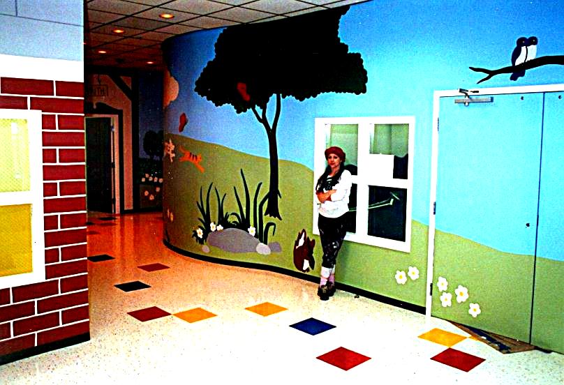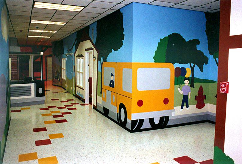 Nissan Child Care Miles of artwork transformed this white walled corporate daycare center into a magical retreat for the kids. |