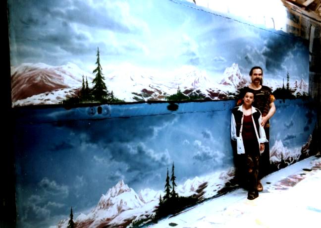 First contact us by email or phone and we will find out a few basics like where, what and when. If you are long distance, email us a photo of your environment and some information about the space where you would like the mural. We can then evaluate how best to proceed with a design. If you need help with a design or ideas for your mural, we are happy to offer many possibilities. Our design phase is included in the price of the mural. For a basic design that we do not paint we charge $150. With a design agreed upon, we will estimate what is required to access the place where the mural will go and how long it will take to complete. Frequently with cloud paintings on a ceiling, we can show you a photo from our large collection of samples and we are ready to paint!