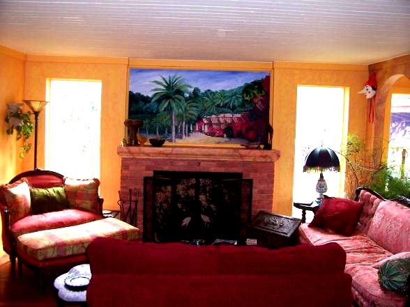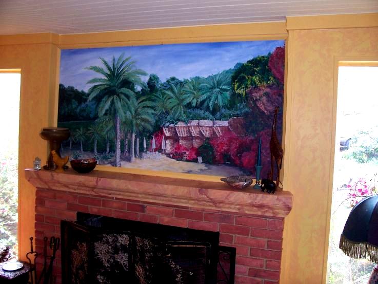 Faux Mantle and Bricks We transformed this clients home while they were visiting Spain. Everything was painted warm golden colors. Faux marble was painted on the existing columns and fireplace. When they came home from Spain, we created the mural above the fireplace from their vacation pictures. |