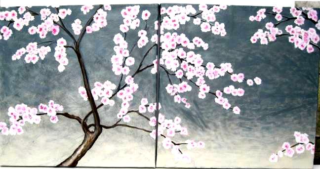 Cherry Blossoms These 26 x 26 canvases were created using swatches and color samples from the client to hand over her bed. |