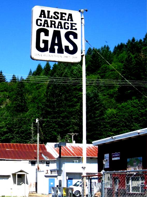 Alsea Garage Gas Don and Helen Peterson owned the Alsea Garage from 1949 to 1999. This sign was painted in 2010. |
