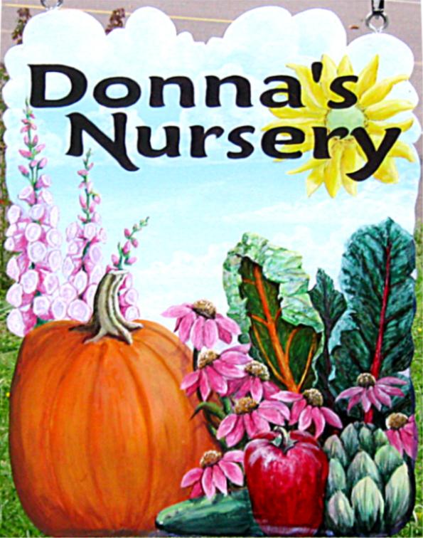 Donnas Nursery Pumpkins, peppers, and Echinacea grace the sign for this downtown Alsea nursery. |