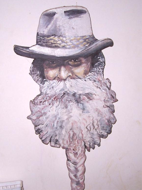Baby Gramps This wood cut-out portrait of Baby Gramps, a salty old time vaudevillian, holds the spot for his rig every year, lest some hippy should swipe it. |