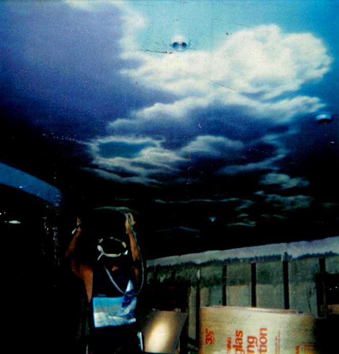 First contact us by email or phone and we will find out a few basics like where, what and when. If you are long distance, email us a photo of your environment and some information about the space where you would like the mural. We can then evaluate how best to proceed with a design. If you need help with a design or ideas for your mural, we are happy to offer many possibilities. Our design phase is included in the price of the mural. For a basic design that we do not paint we charge $150. With a design agreed upon, we will estimate what is required to access the place where the mural will go and how long it will take to complete. Frequently with cloud paintings on a ceiling, we can show you a photo from our large collection of samples and we are ready to paint!
