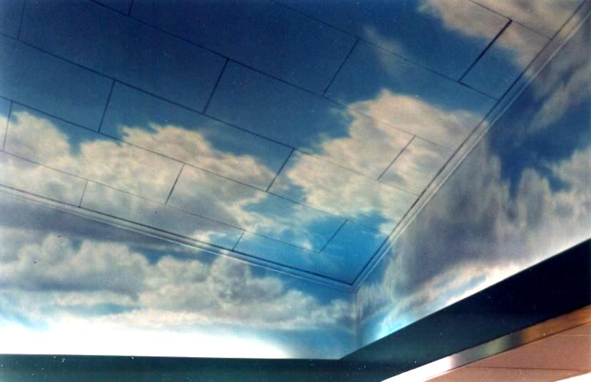 First contact us by email or phone and we will find out a few basics like where, what and when. If you are long distance, email us a photo of your environment and some information about the space where you would like the mural. We can then evaluate how best to proceed with a design. If you need help with a design or ideas for your mural, we are happy to offer many possibilities. Our design phase is included in the price of the mural. For a basic design that we do not paint we charge $150. With a design agreed upon, we will estimate what is required to access the place where the mural will go and how long it will take to complete. Frequently with cloud paintings on a ceiling, we can show you a photo from our large collection of samples and we are ready to paint!