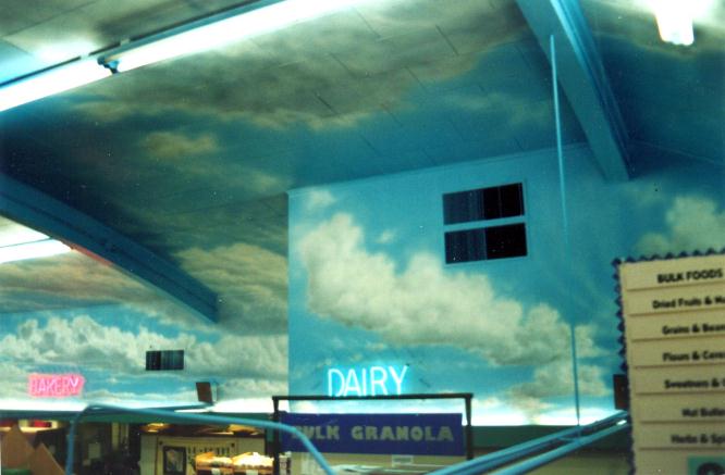 Capella Market aka Oasis One of the largest cloud ceilings we have ever painted was in this old fashioned, long time Eugene grocery store, Oasis. Oasis was sold to Wild Oats and then became Capellas. The building had few windows and a huge arched ceiling creating the perfect location for a cloud mural. KEZI was kind enough to come out and feature this painting on the evening news. |