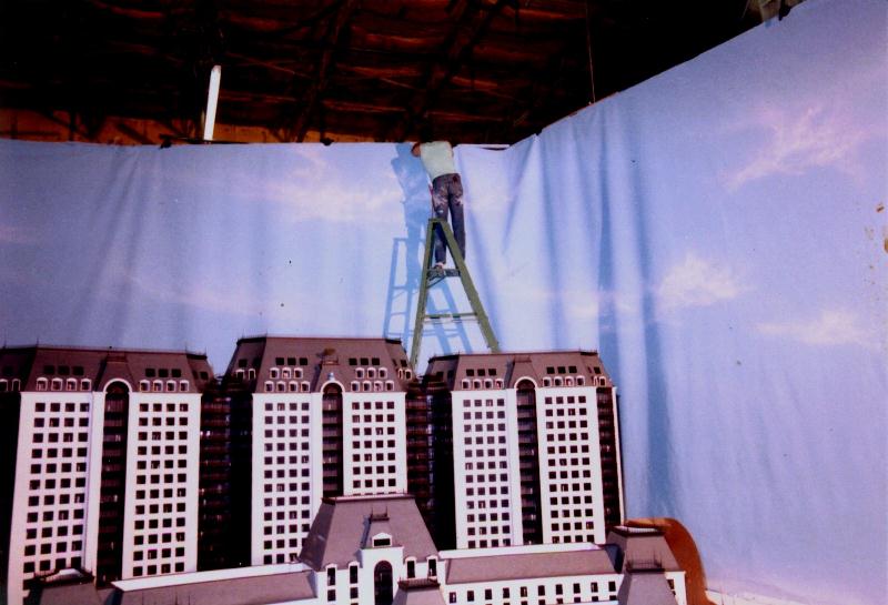 Crescent Model Backing The Crescent Hotel built this huge model prior to constructing the actual building and required our expertise to give the model a realistic background during presentation to the collaborators. The cloud painting was hung in a large semi circle that was 18 tall and ran approximately 70 in length. |
