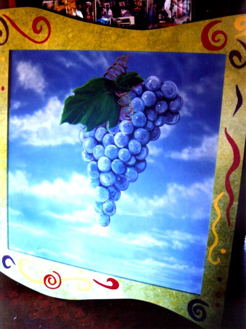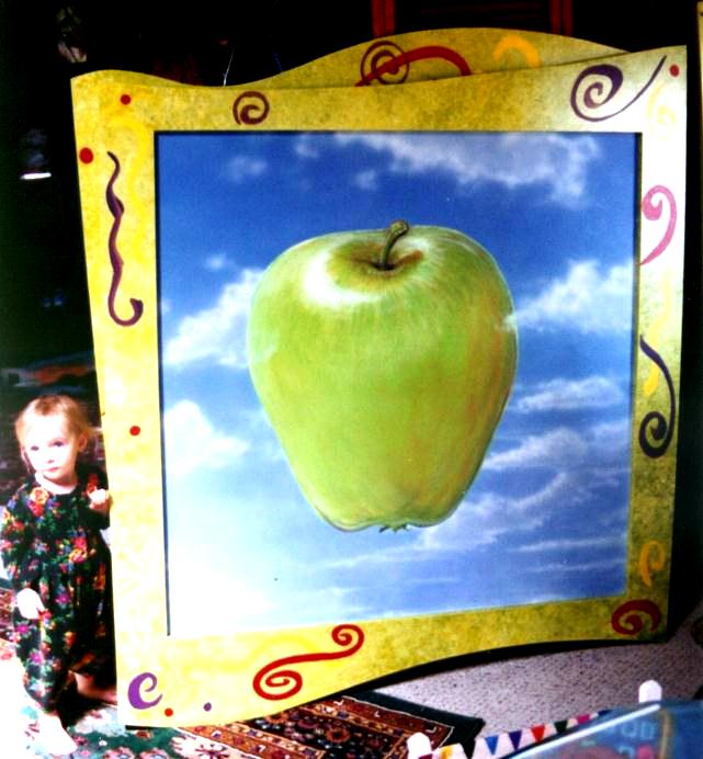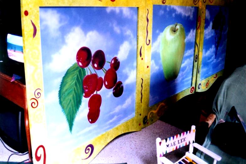 Clouds with Apple Interior Designer, Alexa Milton, designed these paintings for a Seattle restaurant. We built the frames and painted them with a textural finish, enhancing the fruit in the sky. |