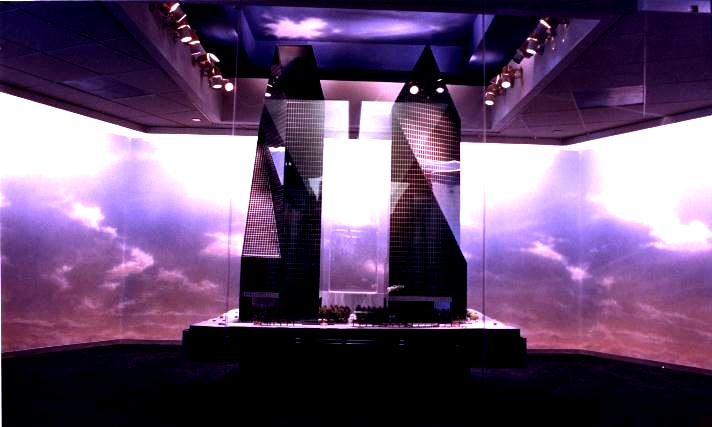 Sky for Allied Bank Tower Model In this photo the model is in the original model room before the Tower was actually built. This cloud mural was painted in the model presentation room for the investors to view. The large cloud panel to the left in this photo is a garage door size panel that raises up to surprise the people sitting in the next room at a 20 foot long meeting table. A very dramatic presentation. This is a perfect example of how well we can paint clouds over an irregular surface to visually smooth a surface and make the sharp corners go away. |