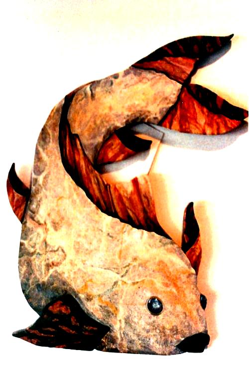 Wood cut-out of fish painted in marble techniques