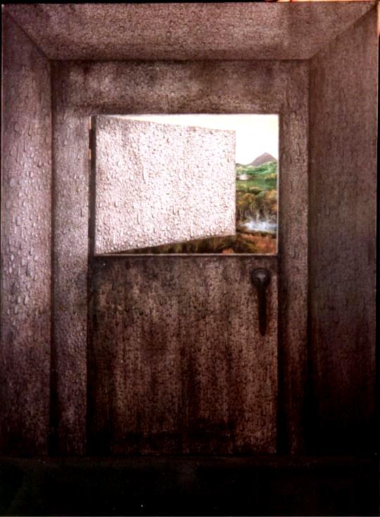 Steam Cabinet Inspired by the Majestic Hotel bathhouse, this is a view through the crack in the bathhouse steam cabinet door, looking out on the ancient hot springs pools. |