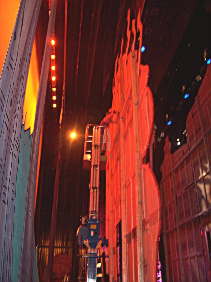 On stage in the Hult with all the flats and backings hanging. Sommer is on the lift taping the seams to stop unwanted light from showing through. |