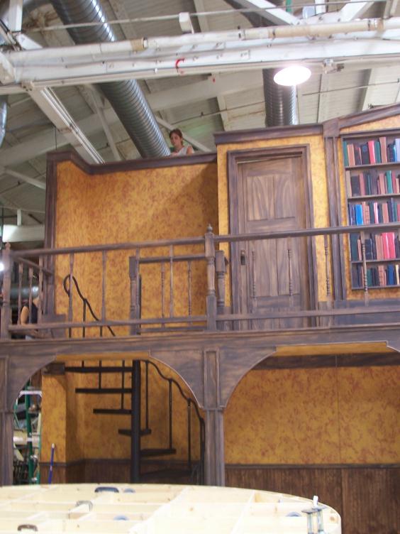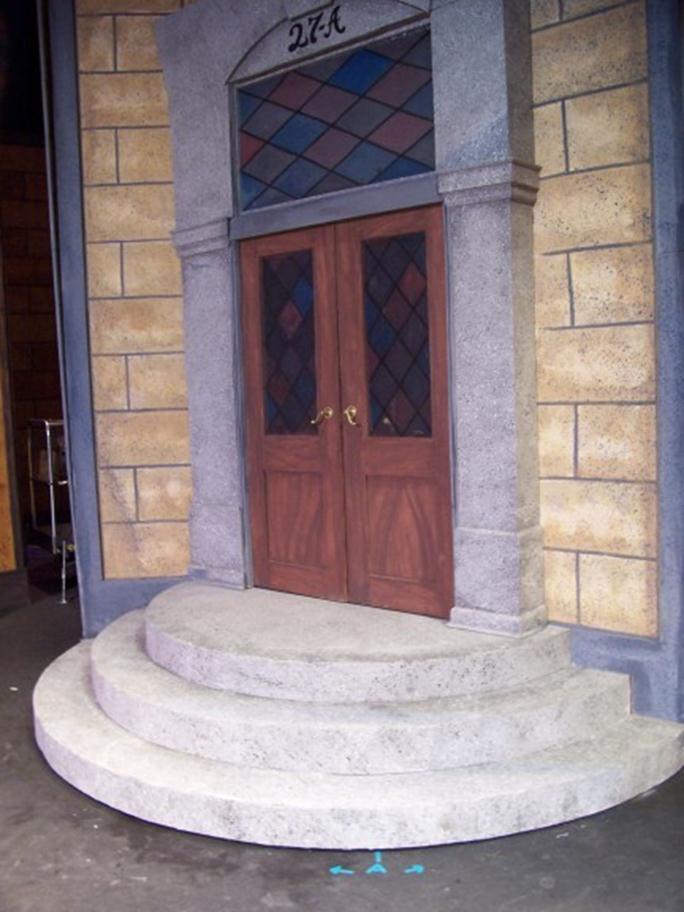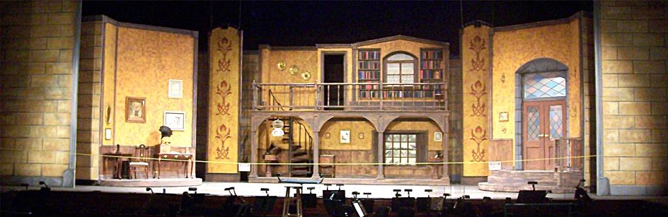 My Fair Lady OFAM Here is the wide view of the set in the Hult center. The desk (Left) and door (Right) are 16 foot wide circular turning wagons with 3 separate sets each 16 feet tall. The stone flats have 13 layers of mud and paint! |