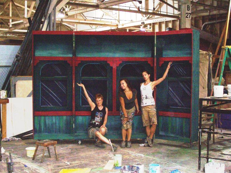 Annie Get Your Gun by Oregon Festival of American Music Sommer, Ruby and Claire stand in front of the train Road Box. Opened up and on stage the Train Seats (bottom photo) position in front of this set piece. |
