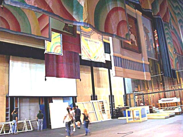 Anything Goes by Cole Porter for Oregon Festival of American Music All the painted canvas backings hanging on the Hult Center main stage in Eugene, Oregon. This set was enormous! You can see the living room flat with the large painting of a horse and rider to the right and the golfer painting to the right of that. |