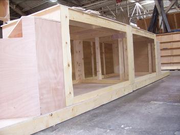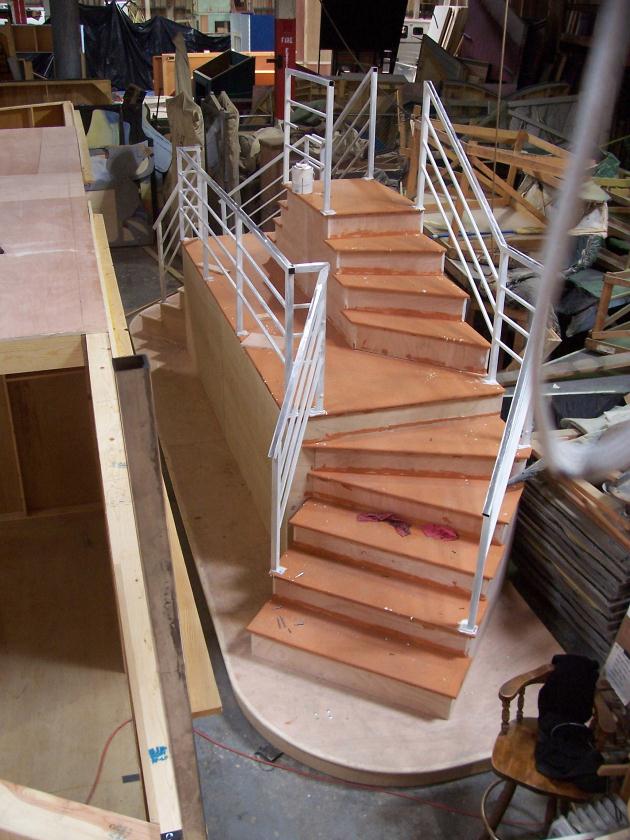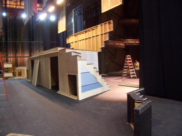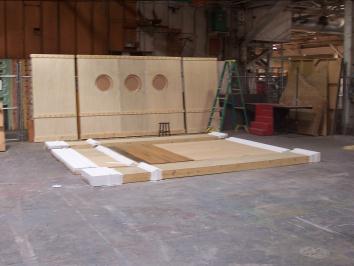 Unfinished main cabin set piece with 216 foot roll out semi circle wagons that hide into the set. Back view. All these pieces disassemble for transport and reassembly on stage. |