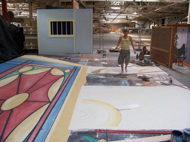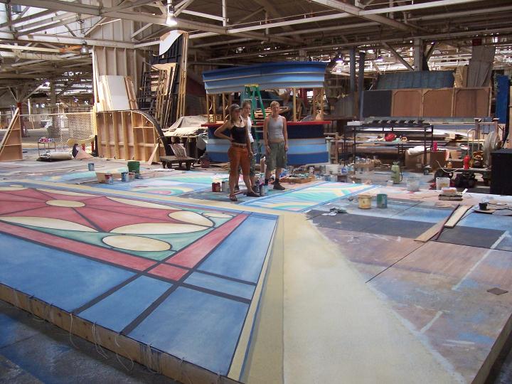 Anything Goes by Cole Porter for Oregon Festival of American Music Elise, Claire and Sommer painting the huge ceiling painting with the Bar prop in the background behind them. |