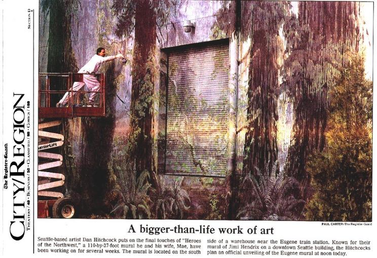 Seattle-based artist Dan Hitchcock puts on the finishing touches of Heroes of the Northwest, a 110-by-27 foot mural he and his wife, Mae, have been working on for several weeks. The mural is located on the north side of a warehouse near the Eugene train station. Known for their mural of Jimi Hendrix on a downtown Seattle building, the Hitchcock's plan an official unveiling of the Eugene mural at noon today. |