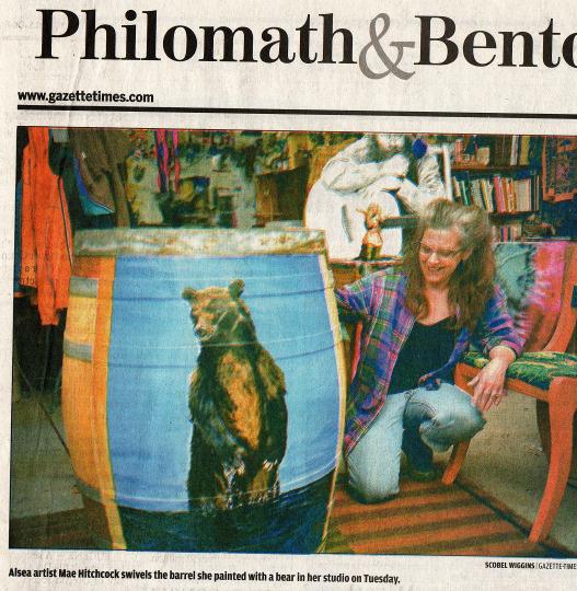 PHILOMATH The wine barrel on the floor in Mae Hitchcocks studio is emerging as a work of art in progress. For the past three weeks, Hitchcock, an Alsea artist, has been transforming the 3-foot by 3-foot barrel from something that used to store red wine into a statement on salmon preservation. So far, Hitchcocks barrel has two species of salmon painted onto it sockeye and coho. Hitchcock has painted the top of the barrel a greenish-marble design. A brown bear is added to her curved, wooden canvas. It looks like hes coming out of the ocean right now, Hitchcock said, of the bear, But thats because I am not done with it. Hitchcock plans to add rocks and foliage around the bear, so it looks like its emerging from the Alsea River. She said she chose a salmon/bear theme in honor of the species found in the Alsea area. Ive put about 15 hours into this so far, Hitchcock said, This is the first time I have ever used a barrel as a canvas. I love it, though I wish I had a barrel of my own. Hitchcocks barrel is one of nine that will be displayed from July 2 to Oct. 17 at various locations in downtown Philomath. The barrels are part of the Philomath Downtown Associations first-ever Roll out the Barrels auction event. Community members and other visitors will be able to bid on the barrels during the display period. Minimum bids are $100. Sixty percent of the proceeds from each winning bid will go to the Philomath Downtown Association; the other 40 percent will go to the artists. For now, the nine artist are busy working on getting their barrels ready for the auction event. All of them are from Benton County, which is one of the criteria for participation in the event. Several artist enjoyed the challenge of painting on a curved canvas. Hitchcock joked she needed a potter wheel to rotate her barrel, which weighs about 80 pounds. The barrels were provided by Spindrift Cellars, which is one of the locations where the barrels will be displayed. Other locations include the Philomath Police Department and the Benton County Historical Society Museum. Members of the Philomath Downtown Associations promotion and design team got the idea from other U.S. cities that successfully held similar wine barrel auction events. We hope it will be promote the arts in downtown. said coordinator Cheri Gavin. We will be providing brochures so guests and tourists can take self-guided tours to view the barrels. The auction bidding will be done online via the Philomath Downtown Associations website at www.myphilomath.org, where interested persons can find more information on the Roll our the Barrels event. |