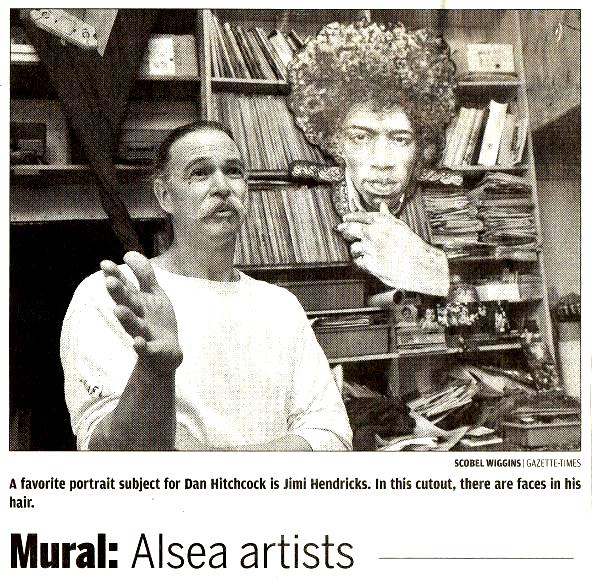 ALSEA Dan and Mae Hitchcock have done hundreds of largescale paintings throughout the west, including stages for the Oregon Country Fair and a massive portrait of Jimi Hendrix staring down on downtown Seattle. Although the married artists are productive, theyve so far keep a low profile in their hometown of Alsea. Were the most unfamous, unknown artist in the world. Dan Hitchcock laughed. Thats changing locally, however, thanks in part to a mural depicting loggers at John Boys Alsea Mercantile, known to locals as the Merc. On April 26, the 8-by 12-foot picture a sepia-tone reproduction of a 1950s photograph off Honey Grove Road was unveiled at the general store. That mural had not been up three minutes when a woman walked out of the Merc and gasped, Thats my brother. Mae Hitchcock said. None of the men from the photo remain, but they have plenty of surviving family in the area. Matt Clark, one of the owners of the business, said his family is considering additional murals depicting local history. The Hitchcocks have lived off South Fork Road since 1995, but they began getting more involved in the community when their daughter, 11-year-old Mae Lee, started attending school. Mae Hitchcock said the mural was a way the pay tribute to Alsea. We love Alsea. We love this place. Its such a nice little town. Mae Hitchcock added, her Mississippi drawl curving around some words. At first glance, the couple might not seem to be a perfect fit for Alsea, a town whose logging roots run deep. But love sometimes works in funny ways. Dan Hitchcock grew up in Arkansas, so he, too, has an accent and a ponytail. His wife wears cat-eye glasses and has royal blue and purple streaks in her hair. Their clothes are dotted with paint splatters. The two met 27 years ago in Texas at a drawing session and were married three months later. We just knew from the first date, from the very first moment. Mae Hitchcock said. The couple moved to Seattle in 1989, but a trip to the Oregon Country Fair sent them looking for property in Oregon. Their first year in Alsea, the Hitchcock's lived in a van on their 20-acer spread, which the Alsea River runs through. Theyre building a house, but until its finished, theyre living out of their studio a cluttered space that has paint cans on the floor next to the couch, which is next to salmon cut-out paintings that soon will be swimming at the Merc. Above on the walls of the studio is a jumbled patchwork of artwork and family photos. Mae Hitchcock said that its fun to tag team paintings with her husband. While shes great with colors and landscapes, he enjoys focusing on portraits. And another set of eyes can help each put the big picture into perspective. On a large painting, you have to get back 1,000 times. Thats the only way you can see it. Dan Hitchcock said. Someday soon, the couple might have a new partner in murals, daughter Mae Lee is a budding artist, too. The mural isnt Dan and Mae Hitchcocks only painting in town. They also have painted small signs for local businesses and sponsor boards for the Alsea School. Dan Hitchcock also has a side business doing pencil portraits. Though theyve painted several murals in Eugene, the Hitchcocks are looking to do more artwork in the Corvallis area. For more information, call the Hitchcock's 487-4231, Hitchcockmastercode@gmail.com or see DanAndMaeHitchcock.com. |