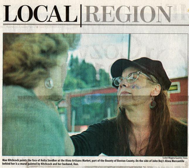 ALSEA Local artists Dan and Mae Hitchcock generally dont participate in artisans markets, but the past two years, the Alsea couple have made an exception. We usually dont do stuff like this, Mae said at her booth at the Alsea Artisans Market, But Dan and I met at a street festival 28 years age, so these types of events are special to us. On Saturday, the Hitchcock's were offering face-painting and portraits at Clark Park, next to John Boys Alsea Mercantile. They were joined by six vendors selling baked goods, produce, jewelry, and quilts. The Alsea Artisans Market is one of 20 destinations on this weekends Bounty of Benton County, a fundraising event that showcases some of the countys rural attractions. Passports, which cost $15, are good for discounts and free items at each stop on the tour. Last years Bounty of Benton County featured 15 locations and raised more than $3,000 for Strengthening Rural Families, an organization that provides parenting support and classes in small communities around the county. John Clark, co-owner of John Boys Alsea Mercantile, said he wasnt sure if the artisans market results in more business for his store, even though a free wine tasting was offered Saturday at John Boys by Philomath-based Pheasant Court Winery. However, Clark said the market brings more people to Alsea, which increases the small towns visibility. It gets people to stop here, at least, instead of buzzing on through, Clark said, They slow down and get a chance to smell the roses. Or baked goods, Pamela Turpen, owner of Turpen Family Farms in Alsea, was selling fruit pies, tarts, cookies and zucchini bread. She was participating in the artisans market for the first time. Im looking forward to this, Turpen said, I didnt do the Corvallis Farmers Market this year, so this will help. Leslie Hockema, who was helping his wife, Sandy, sell peanut butter balls, said he hoped the presence of the artisans market would encourage motorists to take their foot off the gas pedal. Its 25 miles per hour through town. Hockema said. But people are always flying through here at 45 miles per hour and more. Maybe seeing this here will make them slow down. |