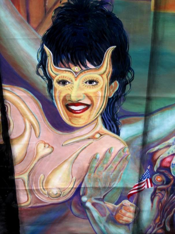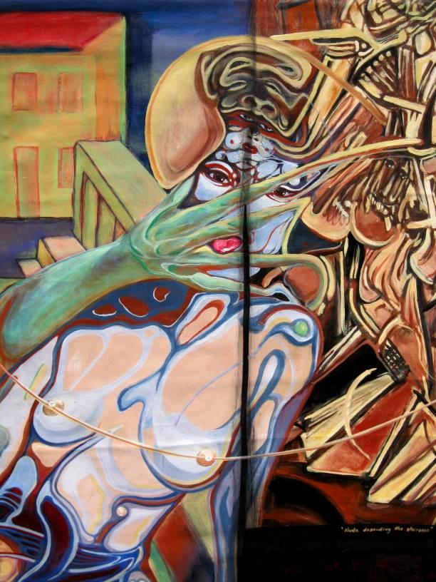 Taks Naga Jubon acrylic on canvas 48 inches by 82 inches available $2000 Tak told me a Naga Jubon is a short sleeved kimono which is what this painting represents. The theme is a spoof of the Dada painters period like Max Ernsts physiomythological flood picture and Aquis Submersus , and Nude descending staircase, so the girls are just making fun of all that seriousness. I think I wouldnt mind having a robe with this painting on it. |